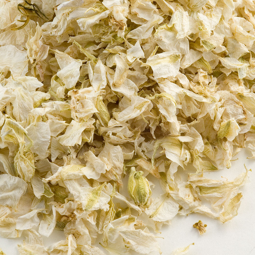 2 Litres of delphinium petals supplied in organza bags with Ivory cone tray and 25 Antique White Cones.