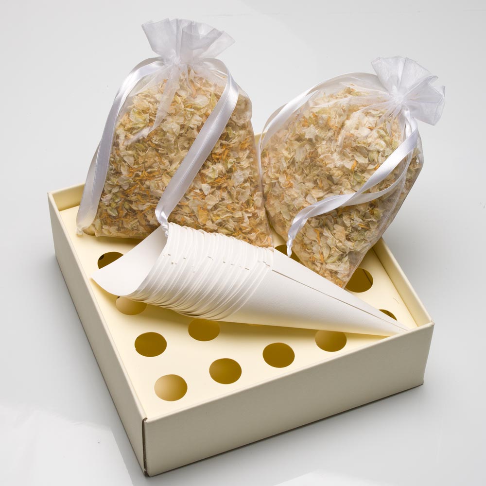 2 Litres of delphinium petals supplied in organza bags with Ivory cone tray and 25 Antique White Cones.