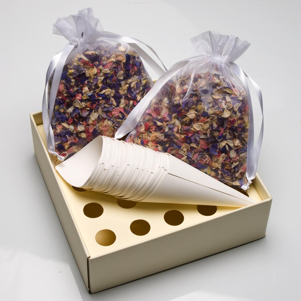2 Litres of delphinium petals supplied in organza bags with Ivory cone tray and 25 Antique White Cones.