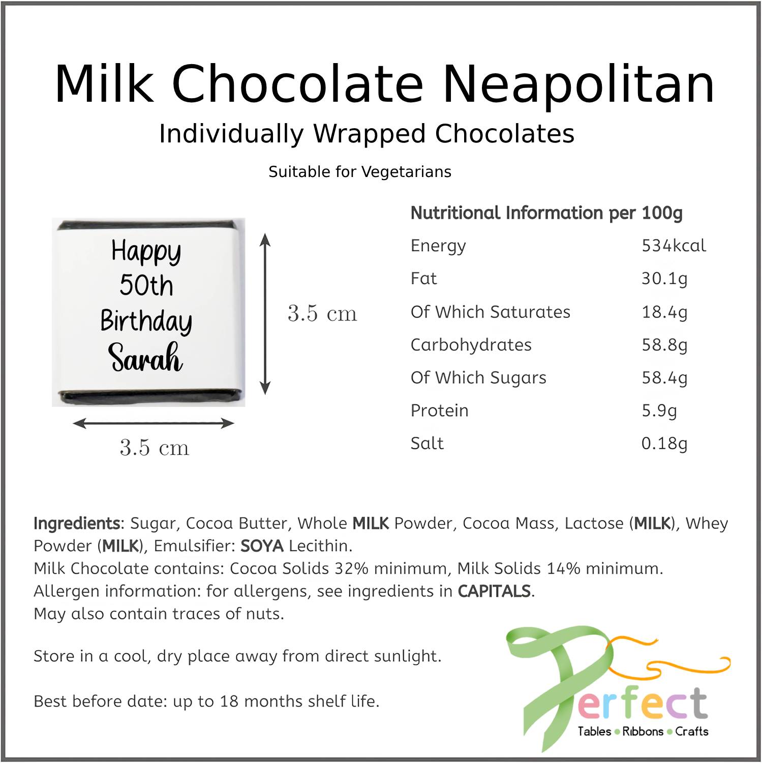 First and foremost, we pride ourselves on using high-quality ingredients. We ensure our personalised chocolate party favours taste as good as they look. For full nutritional and allergen information, please refer to the ingredient labels in the product images. Ultimately, when you choose our personalised chocolate favours, you are choosing quality for your special event.