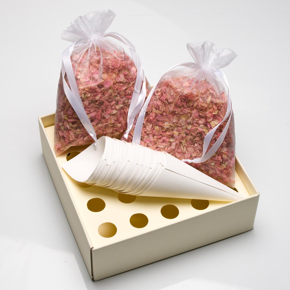 2 Litres of delphinium petals supplied in organza bags with Ivory cone tray and 25 Antique White Cones.