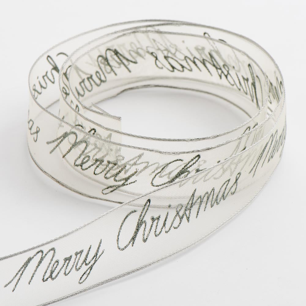 Silver Merry Christmas Organza Wired Edge Ribbon